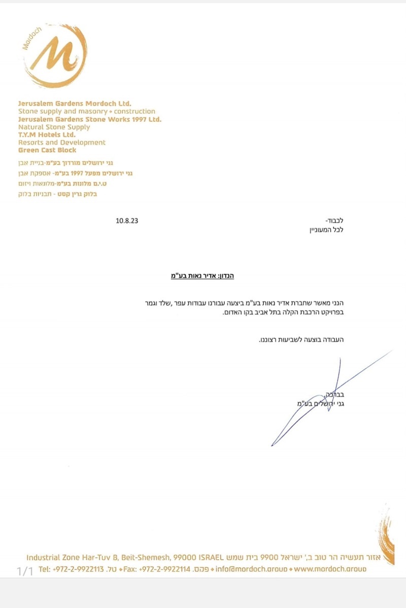 הנני מאשר שחברת אדיר נאות בע"מ ביצעה עבורנו עבודות עפר, שלד וגמר בפרוייקט הרכבת הקלה בתל אביב בקו האדום. העבודה בוצעה לשביעות רצוננו. בברכה גני ירושלים בע"מ