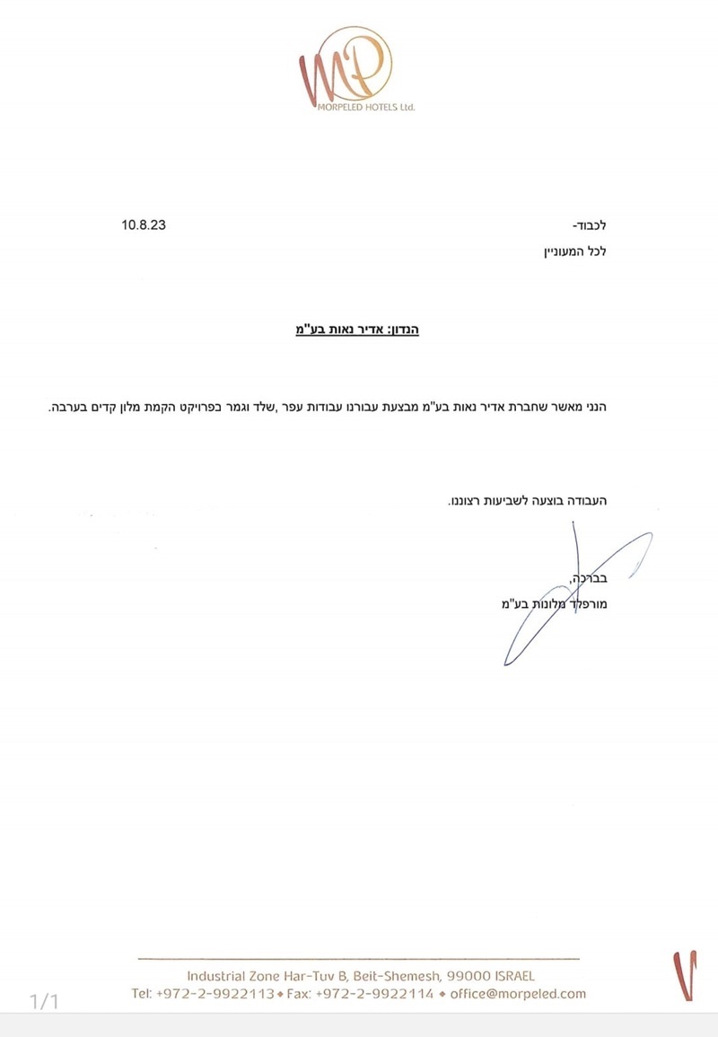 הנני מאשר שחברת אדיר נאות בע"מ מבצעת עבורנו עבודות עפר, שלד וגמר בפרוייקט הקמת מךון קדים בערבה. העבודה בוצעה לשביעות רצוננו בברכה מורפלד מלונות בע"מ.